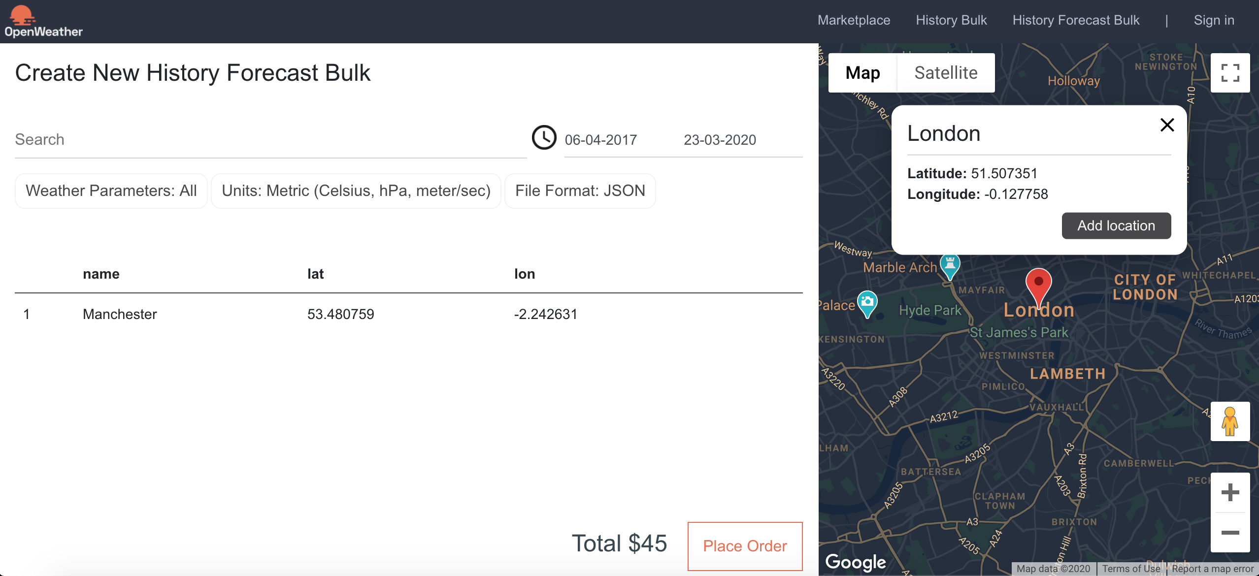 - Go to the OpenWeatherMap Marketplace and choose "New History Forecast Bulk" product.