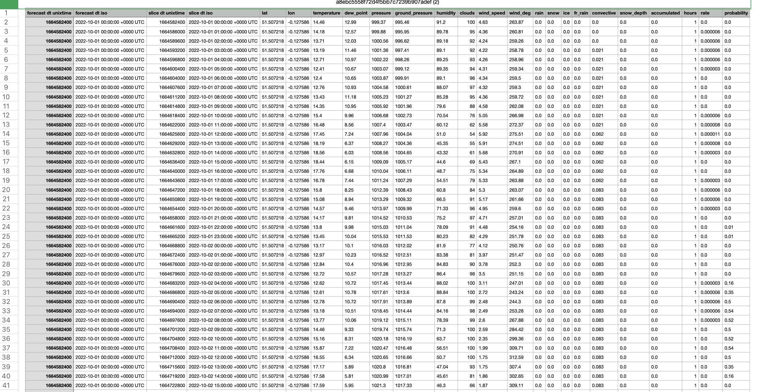 forecast dt unixtimeForecast calculation time in unix timestampforecast dt isoForecast calculation time in ISO formatslice dt unixtimeTime for which the corresponding forecast part was calculated in unix timestampslice dt isoTime for which the corresponding forecast part was calculated in ISO formatlatLatitude of the location, decimal (−90; 90)lonLongitude of the location, decimal (-180; 180)temperatureTemperature, Celsiusdew_pointTemperature of the dew point, CelsiuspressureAtmospheric pressure (on the sea level), hPaground_pressureAtmospheric pressure (on the surface), hPahumidityHumidity, %cloudsCloudiness, %wind_speedWind speed, metre/secwind_degWind direction, degrees (meteorological)rainRain, mmsnowSnow water equivalent, mmiceIce pellets, mmfr_rainFreezing rain volume, mmconvectiveConvective precipitation, mmsnow_depthDepth of snow, maccumulatedAccumulated volume of precipitation, mmhoursNumber of hours for which precipitation values are calculatedratePrecipitation intensity, mm/sprobabilityProbability of precipitation, %